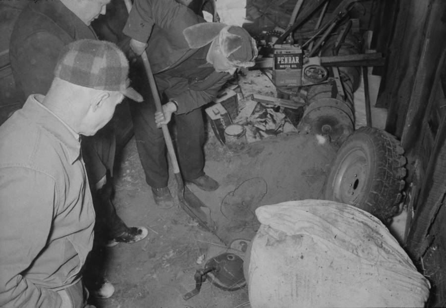 A rendőrök beásnak Gein garázsába. 1957. november 20. - Forrás: Frank Scherschel/A LIFE képgyűjtemény/Getty Images