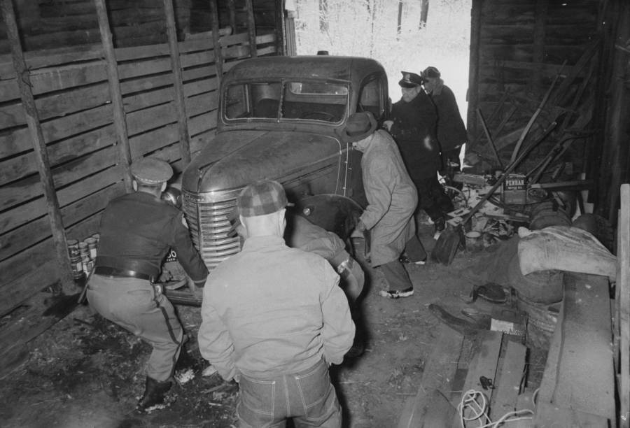 A nyomozók elmozdítanak egy autót, miközben további bizonyítékokat keresnek Ed Gein házában. 1957. november 20. - Forrás: Frank Scherschel/A LIFE képgyűjtemény/Getty Images
