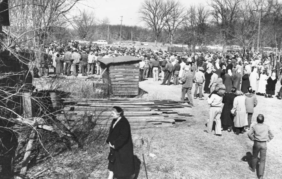 A helyiek Gein letartóztatása után bekutatnak a lakhelyére, miközben bűncselekményeinek híre országszerte elterjedt. 1957. november 1. - Forrás: Frank Scherschel/A LIFE képgyűjtemény/Getty Images