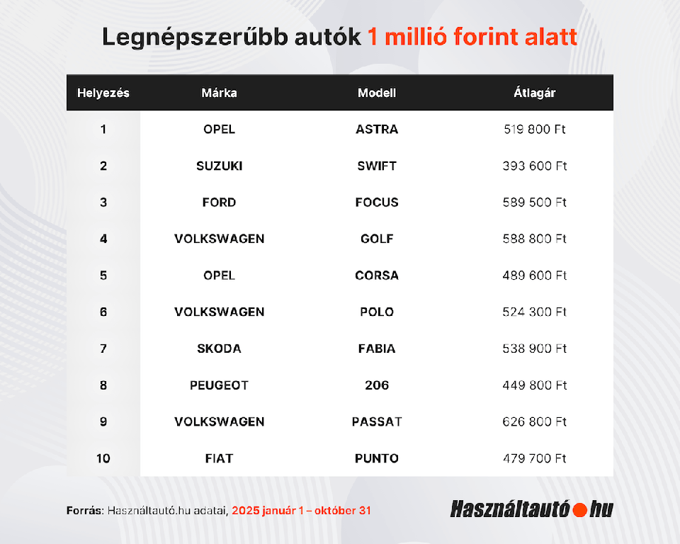 Az 1 millió forint alatti kínálatot egyértelműen a praktikus, fenntartható típusok uralják. A toplista élén az Opel Astra (78 600 érdeklődés) áll, amelyet a Suzuki Swift (74 800) és a Ford Focus (47 200) követ. Ezeket a modelleket az alacsony fenntartási költség, a könnyű alkatrész-ellátás és a tartós technika tartja a népszerűségi lista élén a legolcsóbb szegmensben.