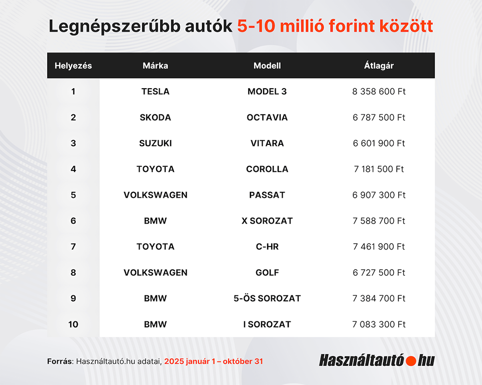 Míg az 1 millió forint alatti kínálatot az Opel Astra, a Suzuki Swift és a Ford Focus uralja, addig a középkategóriában a Golf-Astra-Focus trió a legkeresettebb. A 5–10 milliós ársávban a Tesla Model 3 toronymagasan vezet, míg 10 millió forint felett a BMW és a Mercedes modellek tarolnak, de itt is találunk Tesla autókat a legkeresettebbek között.