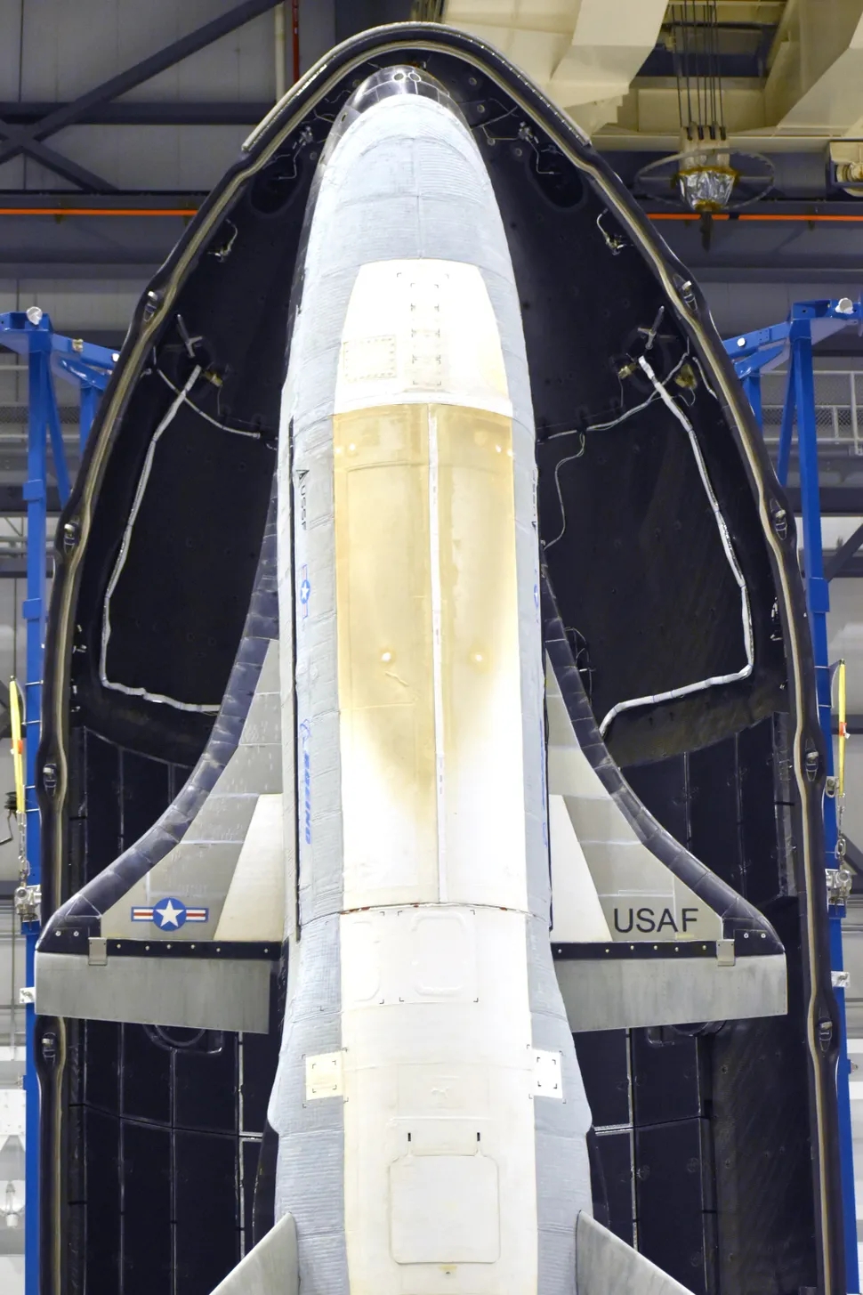 Az X-37B (akkoriban az amerikai légierő által repült) egy ULA Atlas V rakéta hasznos teherburkolatában az első, 2010. április 22-i indítása előtt. - Forrás: US Space Force/Boeing