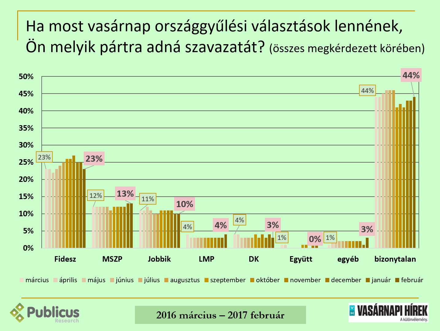 Az elmúlt egy hónapban a Fidesz támogatottsága két százalékpontot csökkenve 23 százalék. Az MSZP és Jobbik tábora nem változott, 13 és 10 százalék, így a pártok közt, a múlt hónapban kialakult különbség is megmarad. A Kétfarkú Kutya Párt erre a hónapra, egy százalékpontot növekedve, 1 százalék, és a Momentum Egyesületet - ami bár nem párt, így nem választható - is, most először, említette egy százaléknyi válaszadó.