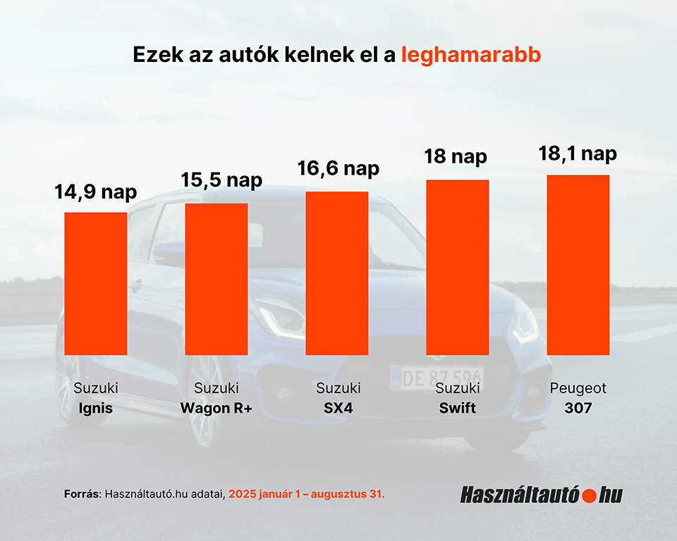 A Használtautó.hu friss, 2025 január–augusztusi adatai alapján egyértelmű, hogy a magyar használtautó-piacon egyes modellek szó szerint napok alatt gazdára találnak. A leggyorsabban eladható típusok listáját a Suzuki vezeti: az Ignis mindössze 14,9 napos átlagos eladási idővel áll az első helyen, szorosan mögötte a Wagon R+ - 15,5 nap, és az SX - 16,6 nap. A negyedik helyen a Suzuki Swift található 18 napos átlagos turnover-idővel, míg az ötödik leggyorsabban eladható modell a Peugeot 307, 18,1 napos értékkel.