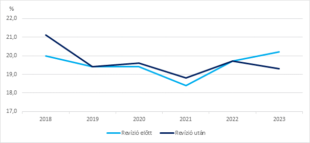 A szegénység vagy társadalmi kirekesztődés kockázatának kitettek aránya a revízió előtt és után