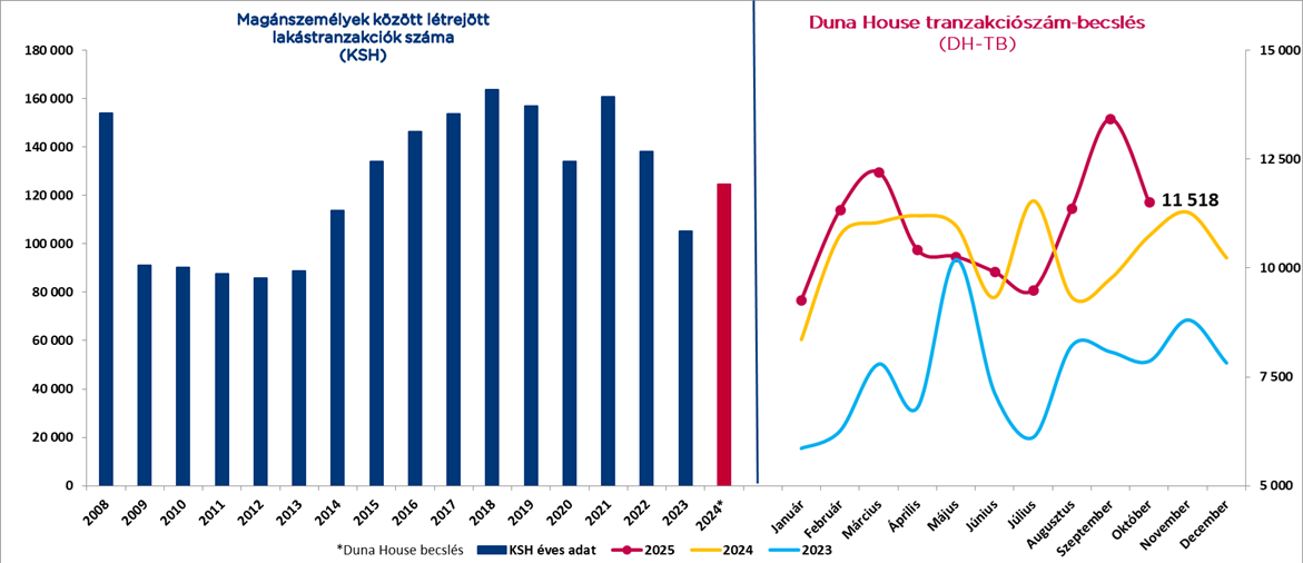 A Duna House Cégcsoport havi Tranzakciószám-becslése (DH-TB) és jelzáloghitel-előrejelzése alapján 2025 októberében országosan 11 518 lakóingatlan cserélt gazdát, a lakáscélú jelzáloghitelek szerződéses összege pedig elérte a 196 milliárd forintot.