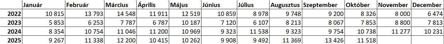 Az alábbi táblázat a Duna House által, az aktuális hónapban becsült havi tranzakciómennyiségeket mutatja.