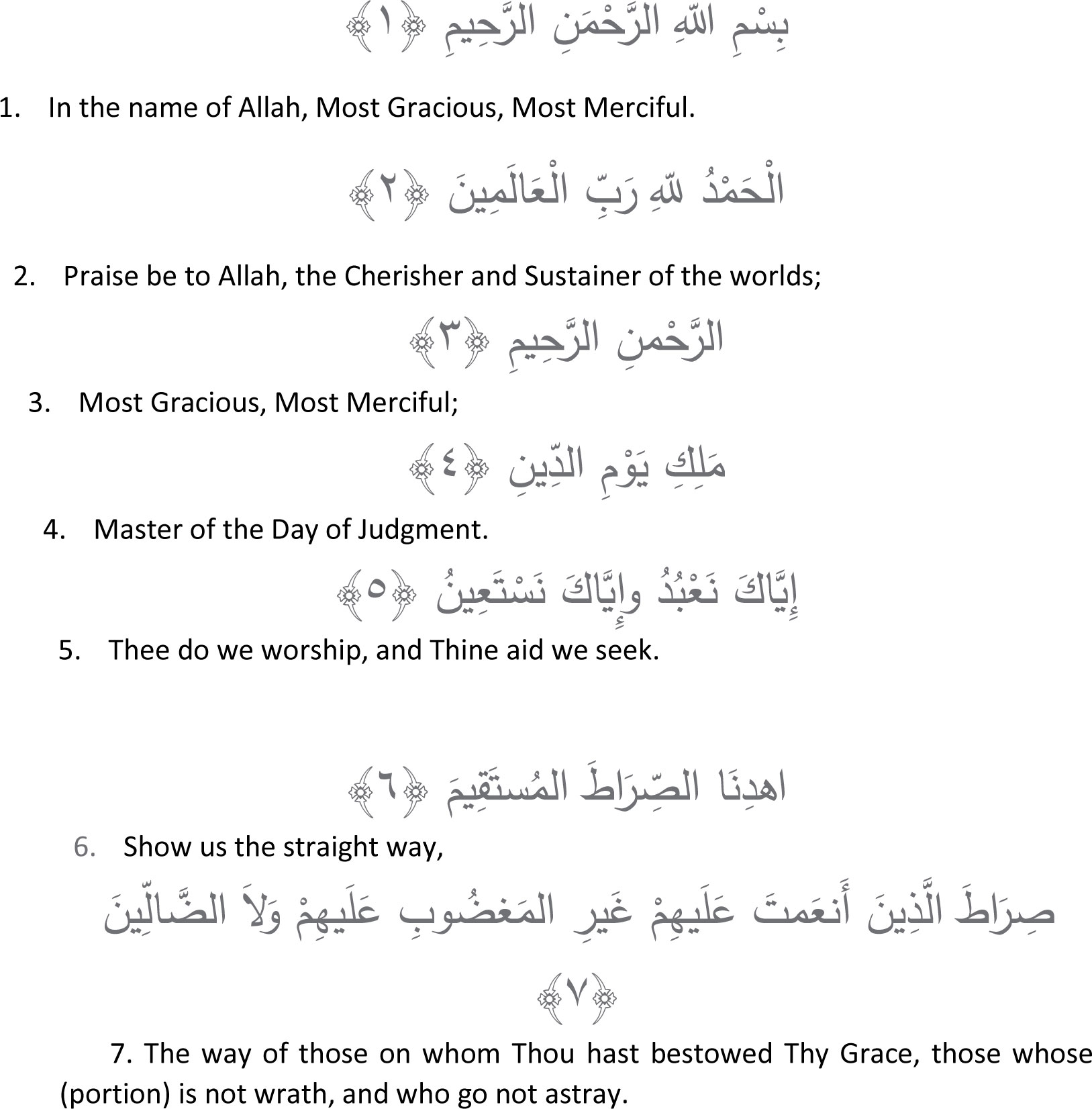The first four verses call for praising God. The fifth is a sort of bargain or deal. In exchange of prayer a divine shelter is the payment. The last two verses describe the obligation of Allah for those who praise Him and move apart from the human context. Their being links them to the entire universe and not to this world only. This is the straight path leading to Him and to the Real Mercy. In order to get this phase one has to leave behind those who deserve the wrath of God. They are those who have willingly not followed the Divine Law or even transliterated them. One also has to leave behind those who changed the Divine law by their foolishness unwillingly and have got astray.