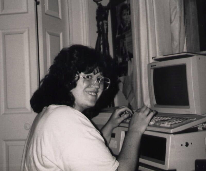 Nancy A. Collins amerikai horroríró az IBM Clone 8088 számítógépénél, amelyen első két regényét, a Napszemüveg sötétedés után és a Kísértőt írta (1988 vagy 1989). - Forrás: Infrogmation/Wikimedia Commons
