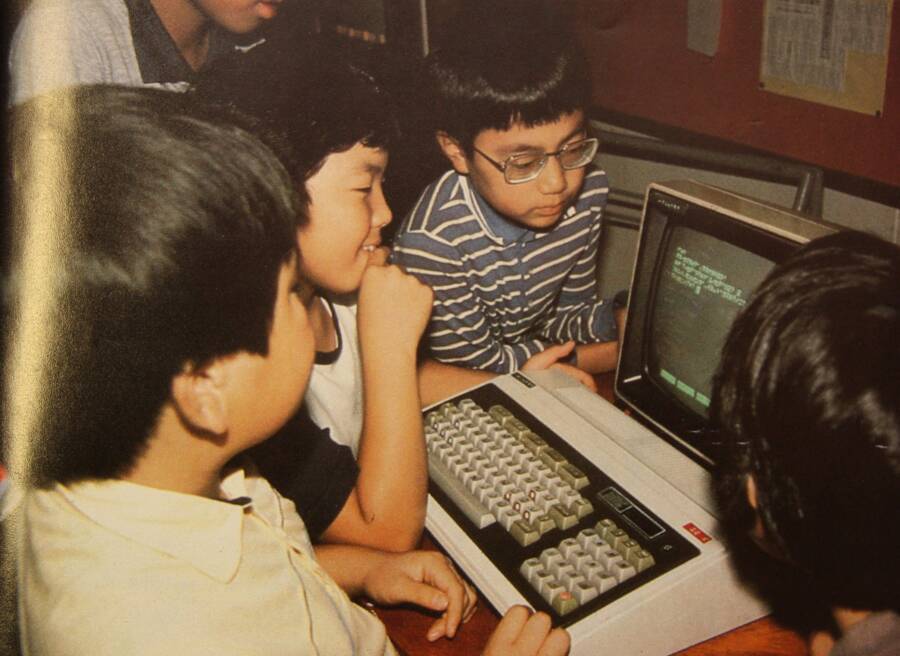 Japán iskolás gyerekek gyűltek össze egy számítógép körül. Körülbelül 1980.- Forrás: Steven Miller/Flickr Creative Commons