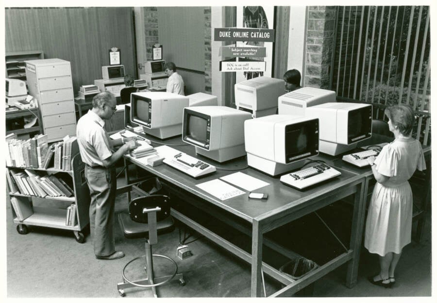 A Duke Egyetem alkalmazottai adatokat adnak hozzá az egyetem online katalógusaihoz az 1980-as években.- Forrás: Duke Egyetemi Archívum/Flickr Creative Commons
