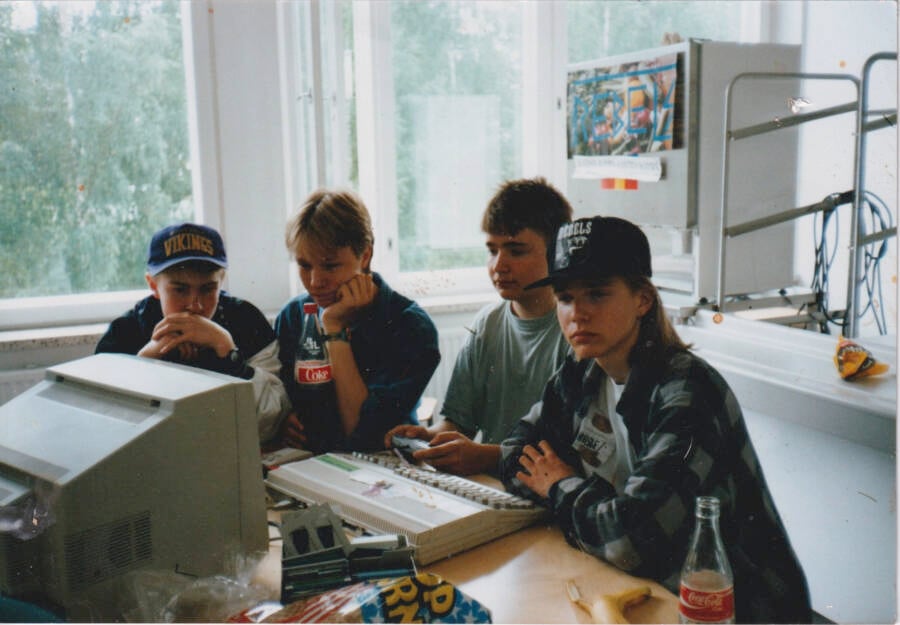Egy baráti társaság gyűlt össze egy Commodore Amiga körül. Az 1980-as évek vége vagy az 1990-es évek eleje. - Forrás: Ville MJ Hyvönen/Flickr Creative Commons