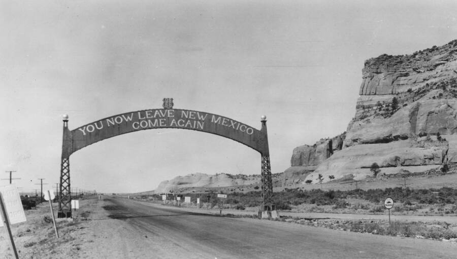 Egy tábla, amely tájékoztatja a 66-os úton közlekedő autósokat, hogy elhagyják Új-Mexikót. 1938.