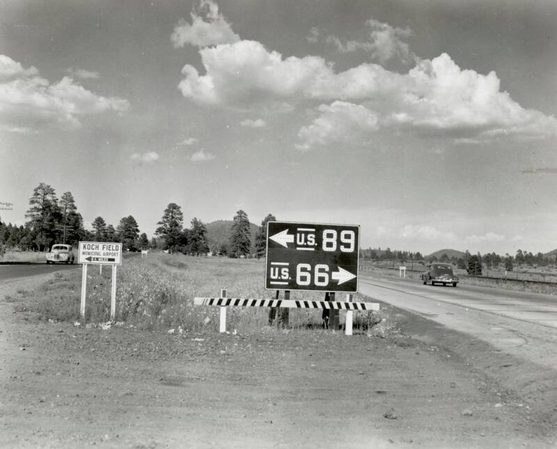 Közlekedési táblák Flagstaff közelében, Arizonában. 1948.