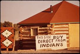 Egy őslakos amerikai tulajdonban lévő üzlet a 66-os út egyik oldalán Arizonában kihív egy másik, fehér tulajdonban lévő üzletet a másik oldalon. 1972.