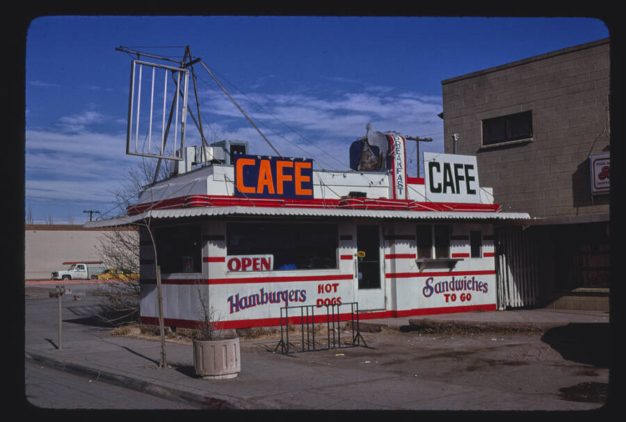 Fern's Cafe, egy megálló a 66-os út mentén, Towandában, Illinois államban. 1954.