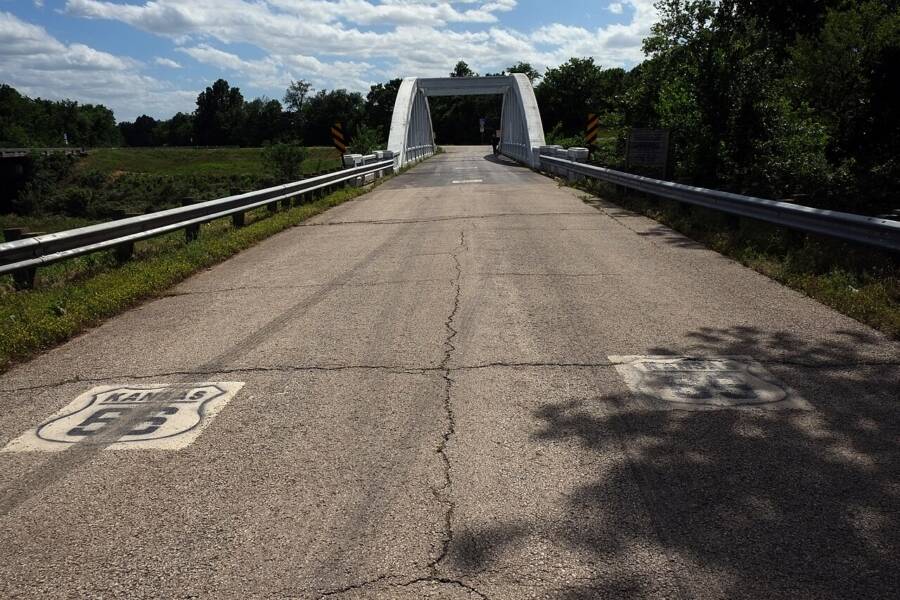 A 66-os út hidakon és utakon is áthaladt, beleértve a Chain of Rocks hidat is, amely Missourit és Illinoist köti össze. Körülbelül az 1940-es években.