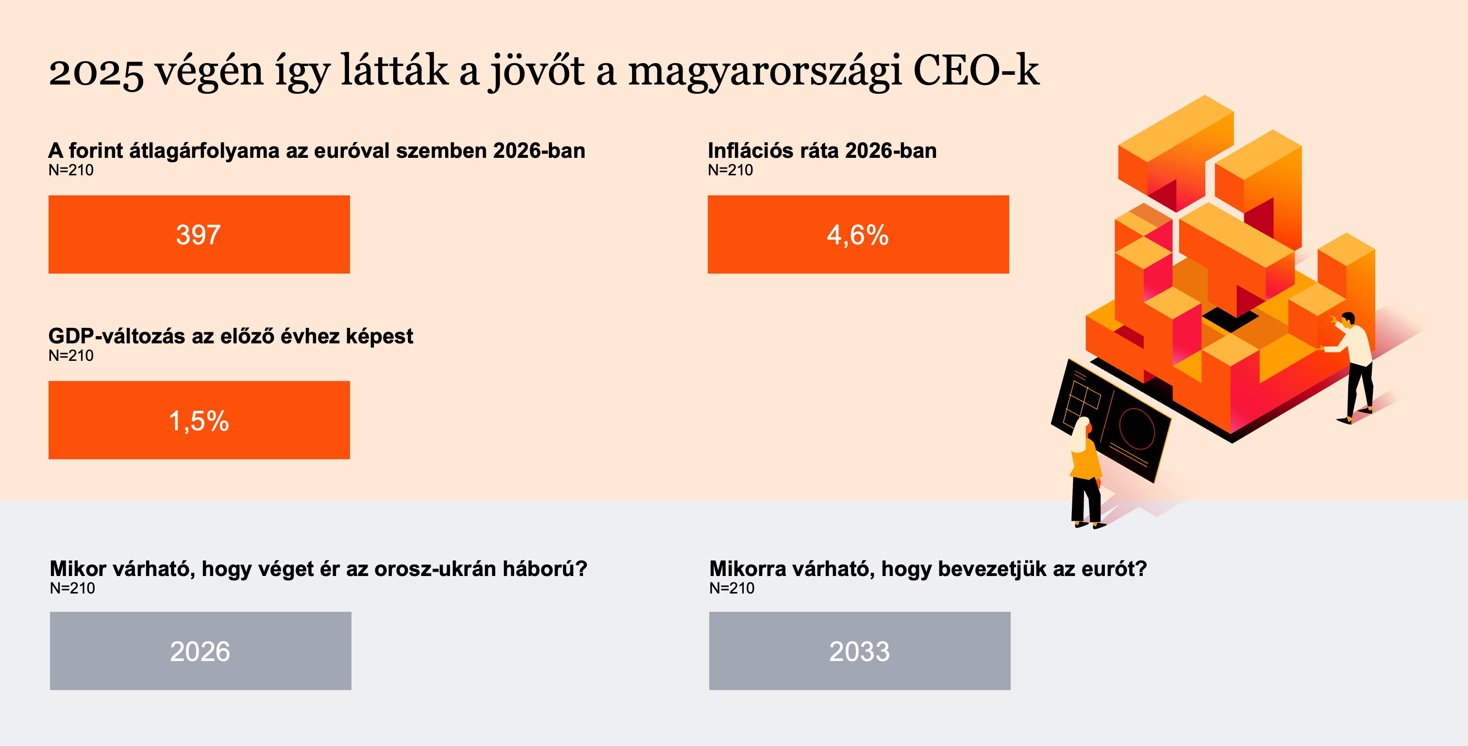 A magyar vezetők jóval optimistábbak globális társaiknál, ha a világgazdaság növekedéséről van szó: 71% bízik annak élénkülésében, szemben a nemzetközi 61%-kal, és mindössze 5% számít lassulásra az előző év üteméhez képest. Ugyanakkor a hazai gazdasággal kapcsolatos kilátások már árnyaltabb képet mutatnak. A korábbi 60%-hoz képest idén csupán 53% vár gyorsulást, ami egyértelműen utal a bizalom romlására.