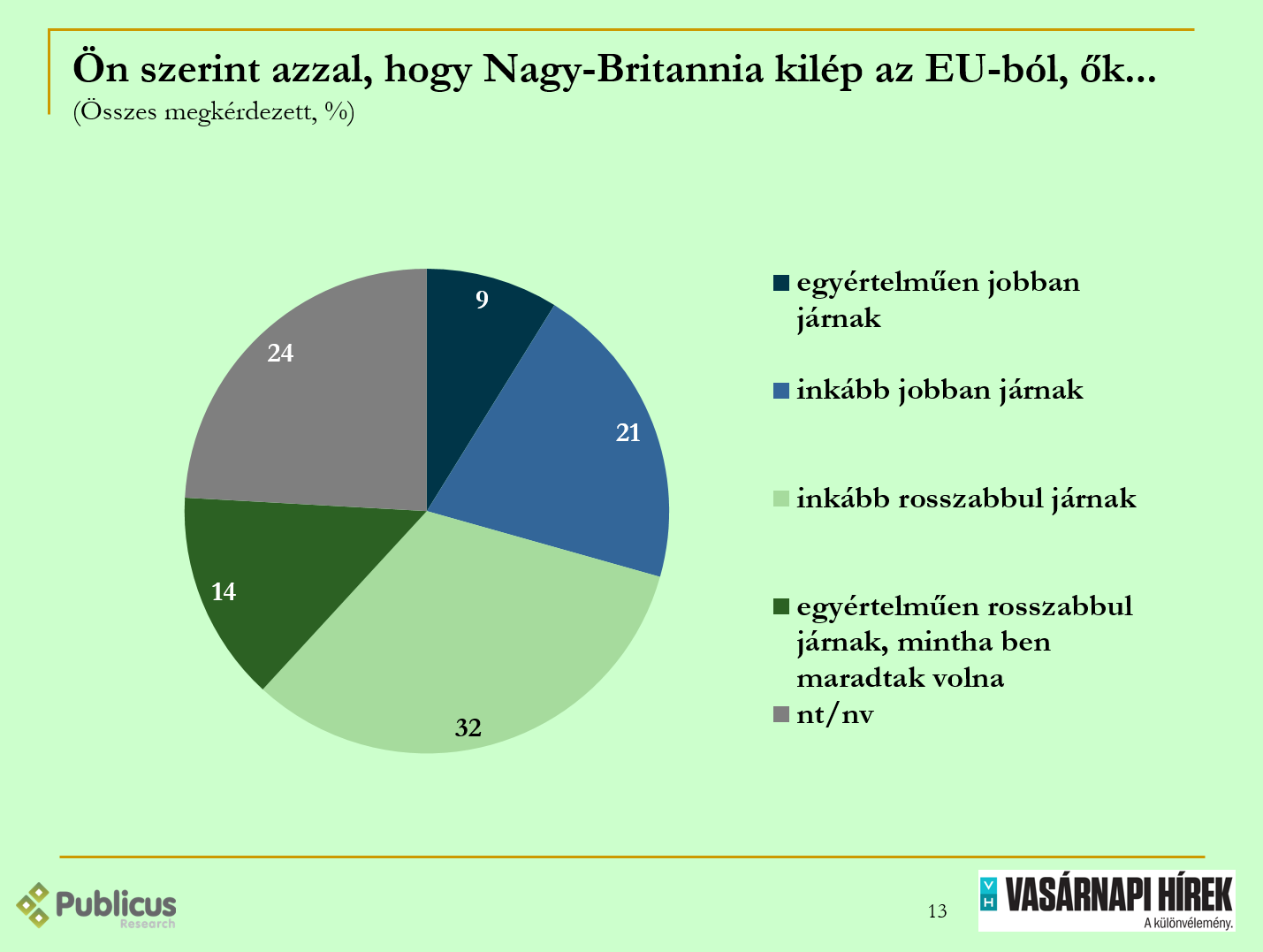 A Publicus Intézet a Vasárnapi Hírek megbízásából, július 1 és 6 között, 1000 fő megkérdezésével készített reprezentatív közvéleménykutatásban vizsgálta a választók Európai Unió, és intézményei nyilvánosságbeli megítélését. Tíz megkérdezettből héten azt gondolják, hogy az EU tagságunk első évtizede előnyős volt számunkra. Ez 13 százalékpontos növekedés az egy évvel ezelőtti kutatásunkban mértekhez képest. A megkérdezettek majd’ kétharmada szerint tagságunkból nyújtotta lehetőségeket inkább ki tudtuk használni. Ezt egy évvel ezelőtt 7 százalékpontnyival kevesebben gondolták még így. A választók egyértelmű többsége, kétharmada egy most esetlegesen tartandó népszavazáson újra belépne az EU-ba. A biztos szavazók körében ez háromnegyedes támogatottságot jelent. Ez az arány szintén 7 százalékponttal növekedett az egy évvel ezelőttihez képest.