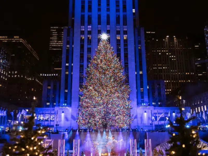 A New York-i Rockefeller Center karácsonyfája a világ egyik legismertebb ünnepi szimbóluma. Bár magassága általában 20–25 méter, így nem tartozik a rekorddöntő óriások közé, ikonikus státusza vitathatatlan. A több tízezer LED-fénnyel díszített, élő lucfenyőt minden évben egy hatalmas, kristályokkal kirakott csillag koronázza meg. A fa felállítása és ünnepélyes kivilágítása világszerte milliókat vonz New Yorkba, és a karácsonyi szezon hivatalos kezdetét jelenti az Egyesült Államokban.