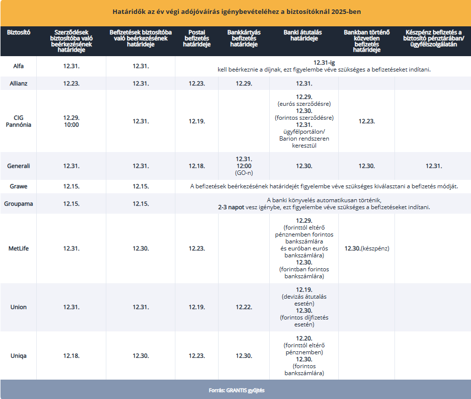 A biztosítók és pénztárak többsége még az év utolsó napjaiban is fogadja a nyugdíjcélú megtakarításokkal kapcsolatos szerződéseket, belépési nyilatkozatokat és a befizetéseket az adójóváíráshoz. Vannak viszont olyan pénzintézetek is, amelyek korábban zárnak – jelezték összefoglalójukban a Grantis szakértői.