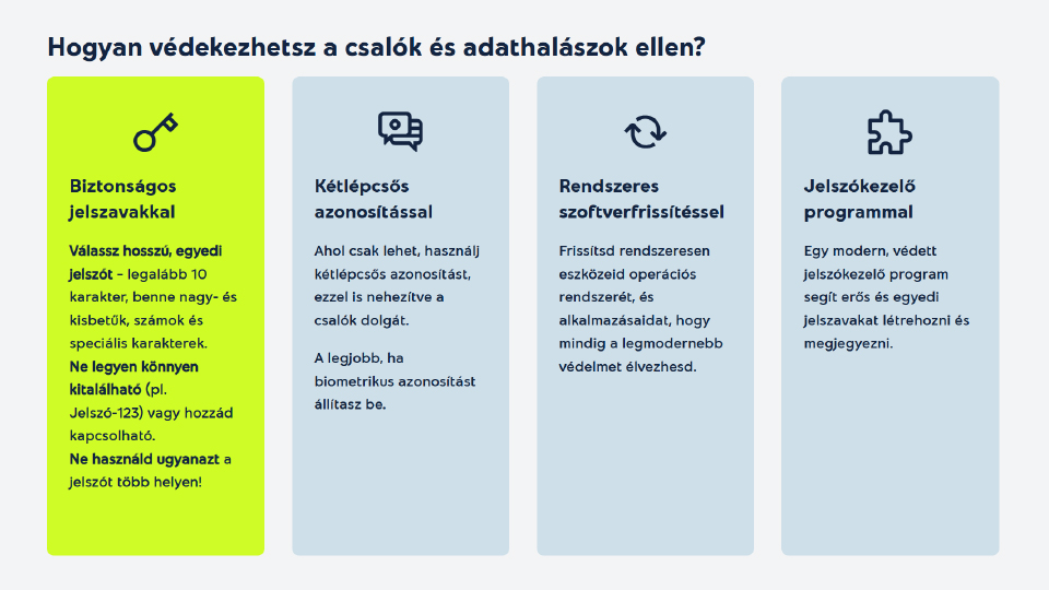 Ha utólag kiderül, hogy megadtuk a jelszavunkat egy csalónak, azonnal változtassuk meg az adott fiók és minden olyan más oldal jelszavát is, ahol ugyanezt használtunk. Ebben segíthet a jelszókezelő program használata is, ami biztosítja, hogy minden fiókhoz más, erős belépőkódunk legyen.