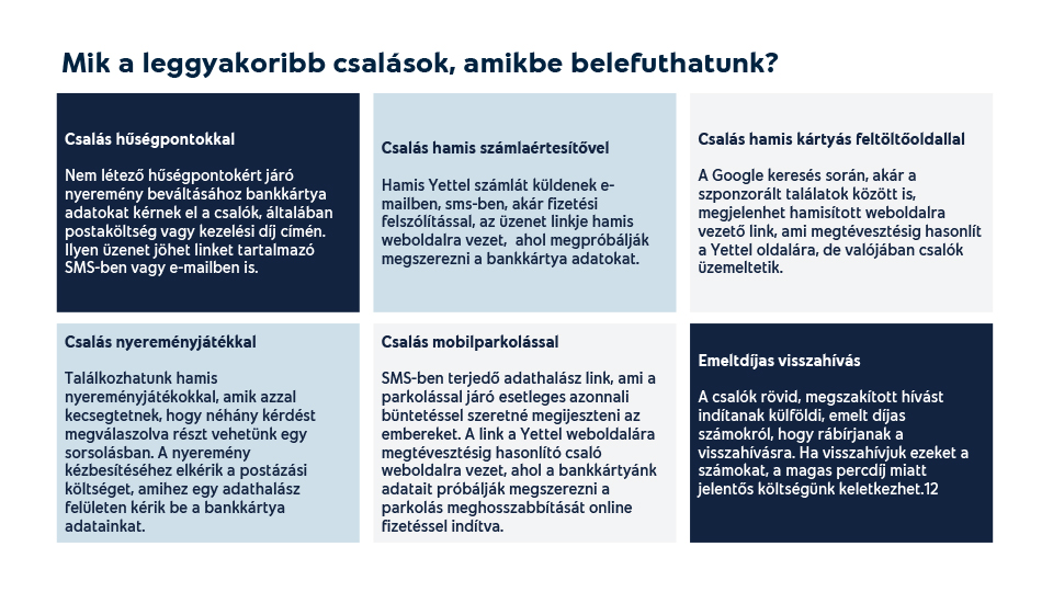 Váratlan befizetésre váró számla, sürgető fizetési felszólítás vagy egy nyereményjáték, amin nem is vettünk részt? Napról napra olvashatunk olyan híreket, hogy ismert vállalatok nevében és arculatában küldenek üzeneteket csalók, hogy pénzt szerezzenek vagy visszaéljenek az adatokkal. Mik a leggyakoribb csalástípusok, hogyan lehet felismerni a megtévesztő trükköket és mit tegyünk, ha mégis megtörtént a baj? A Yettel szakértői a cég megújult online számlaértesítő kapcsán most segítenek, hogyan ismerhetjük fel és védhetjük ki az internetes csalásokat.