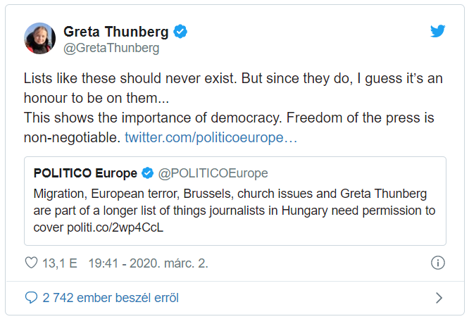 A Politico cikkére reagált a klímavédő aktivista. - írja a parameter.hu.