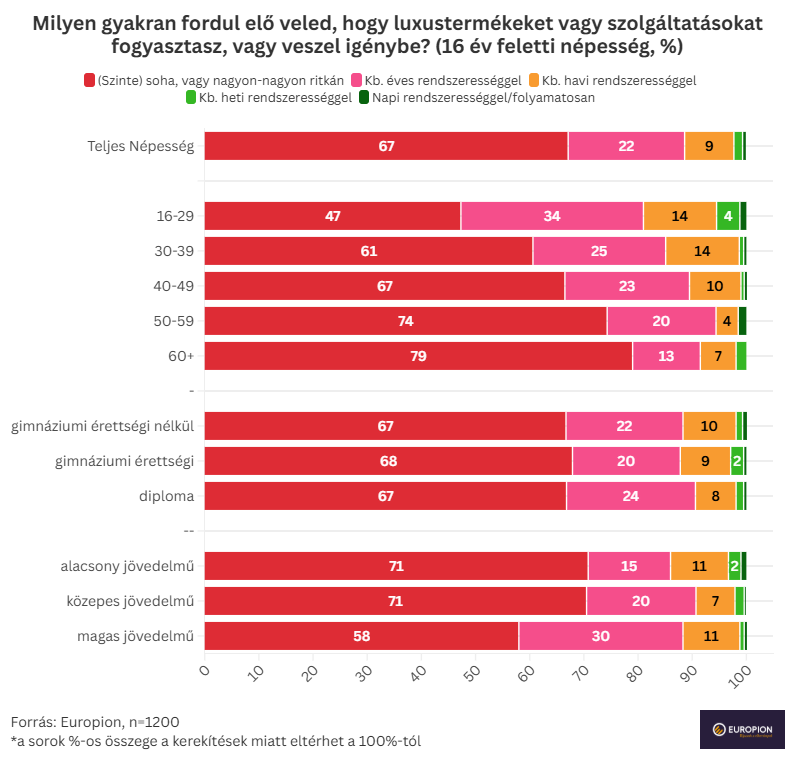 A kutatás szerint a magyarok kétharmada (67%) szinte soha vagy csak nagyon ritkán fogyaszt luxustermékeket vagy szolgáltatásokat (II. ábra). Ez különösen jellemző az idősekre (60+: 79%) és a falusi lakosságra (72%). Ezzel szemben a fiatalok körében jóval gyakoribb: a 16–29 évesek közel fele (47%) évente, 14%-uk pedig havonta enged meg magának valamilyen luxust.