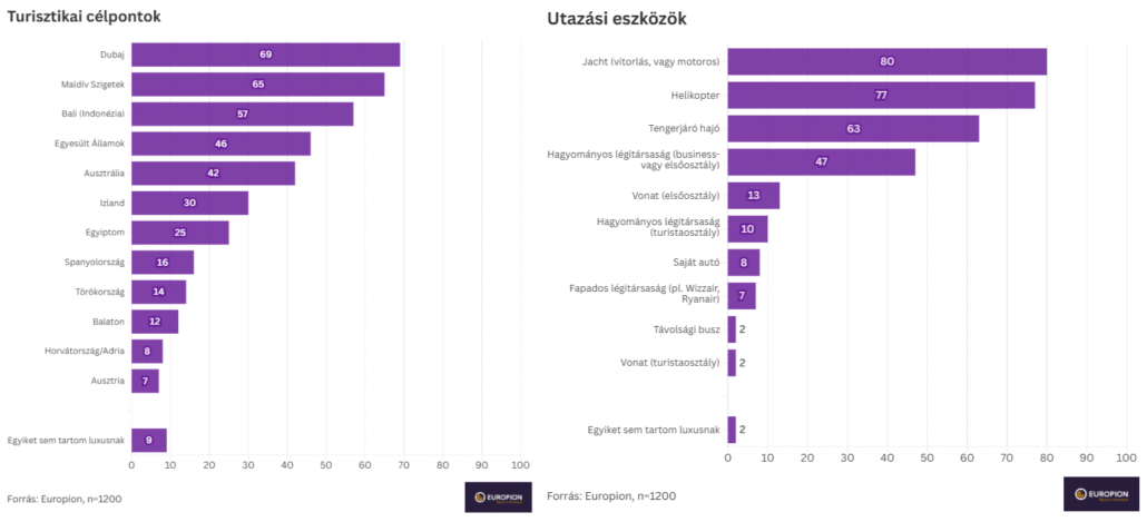 Az utazási módok közül a jachtozás (80%), a helikopterezés (77%) és a tengerjáró hajózás (63%) egyértelmű luxusnak számítanak a döntő többség szemében.. A business- vagy első osztályú repülést viszont csak a megkérdezettek kevesebb mint fele (47%) sorolta ide. A fapados és a hagyományos légitársaságok közötti különbséget alig érzékelik (7% vs. 10%), ezek már aligha mennek luxusszámba a társadalom nagyrésze számára.