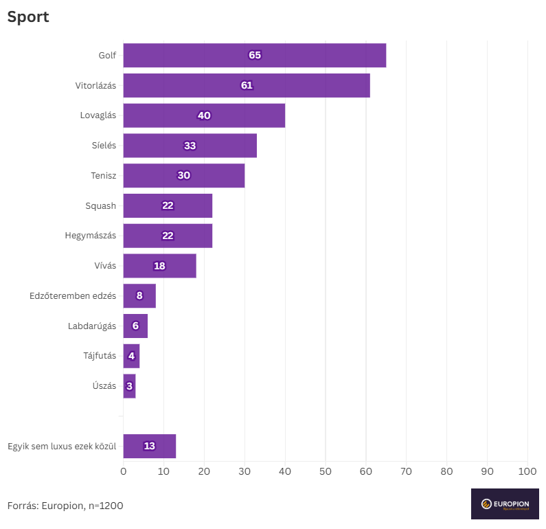 A golf (65%) és a vitorlázás (61%) a legtipikusabb luxussportok, őket követi a lovaglás (40%), a síelés (33%) és a tenisz (30%). Érdekesség, hogy a fiatalok sokszor hajlamosabbak luxusnak látni az egyes sportokat, mint az idősek – kivéve a golfot, ahol az idősek (66%) valamivel nagyobb arányban tekintik fényűzésnek, mint a fiatalok (62%).