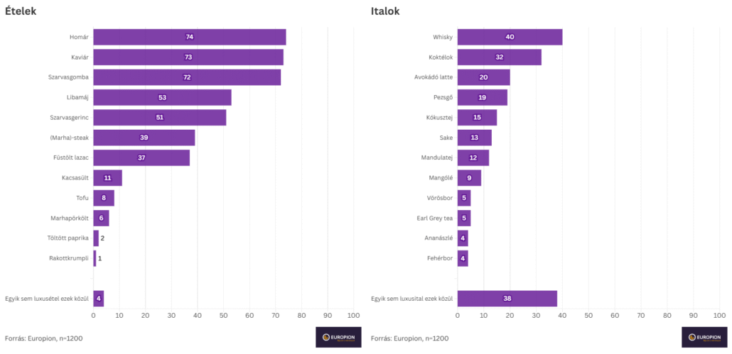 Az italok közül a whisky (40%) és a koktélok (32%) kapták a legtöbb szavazatot, de általánosságban kevésbé számítanak luxusnak a magyarok szemében, mint az ételek. Az utóbbi időkben a 15 perc közéleti hírnévben lubickoló avokádó latte például csak minden ötödik magyar szemében luxustermék (20%).