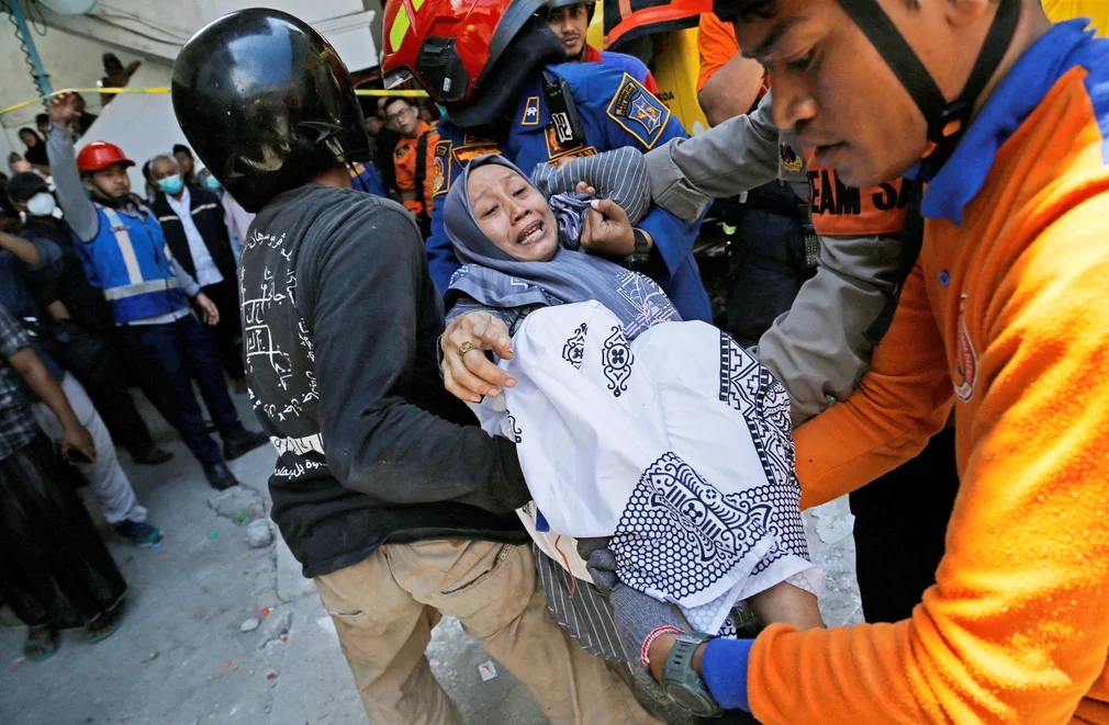A kutató-mentő csapat tagjai egy kelet-jávai iskolaépület összeomlásában elhunyt személy hozzátartozóját viszik magukkal. -