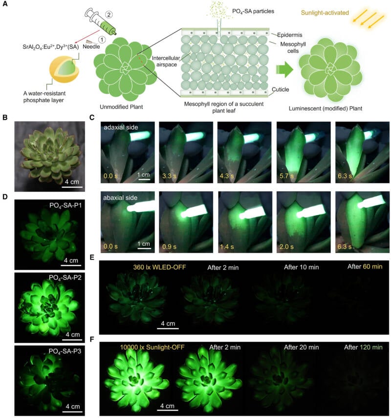 Foszforrészecskék pozsgásokba injektálásával és a levelek napfénynek vagy LED-fénynek való kitételével a kutatók akár két órán át is világítani tudták a növényeket.
