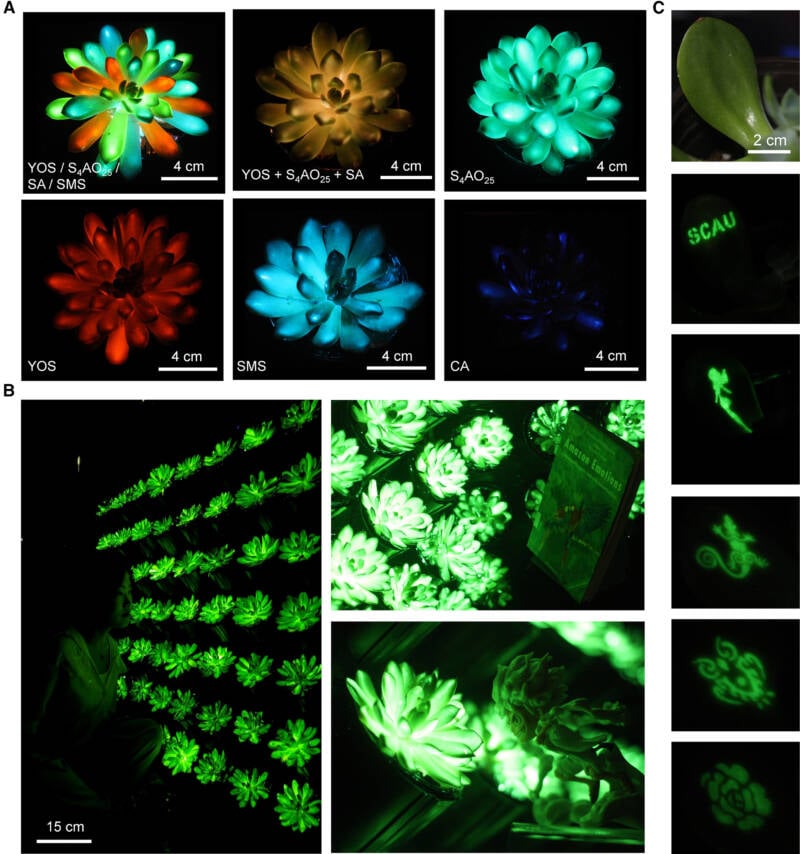 A Xuejie Zhang vezette csapat mikron méretű foszforrészecskékkel itatta át az Echeveria „Mebina” pozsgás növényeket – egy gyakori szobanövényt. Ezek a részecskék, stronciumból és alumíniumból, valamint más fémekből készült szintetikus anyagok, különböző színű fényt bocsátanak ki. Ennek köszönhetően a szakértőknek sikerült lélegzetelállító látványt nyújtani, amelyben a növények nemcsak ragyogó zöld, hanem kék, piros és kékeslila árnyalatban is ragyognak.