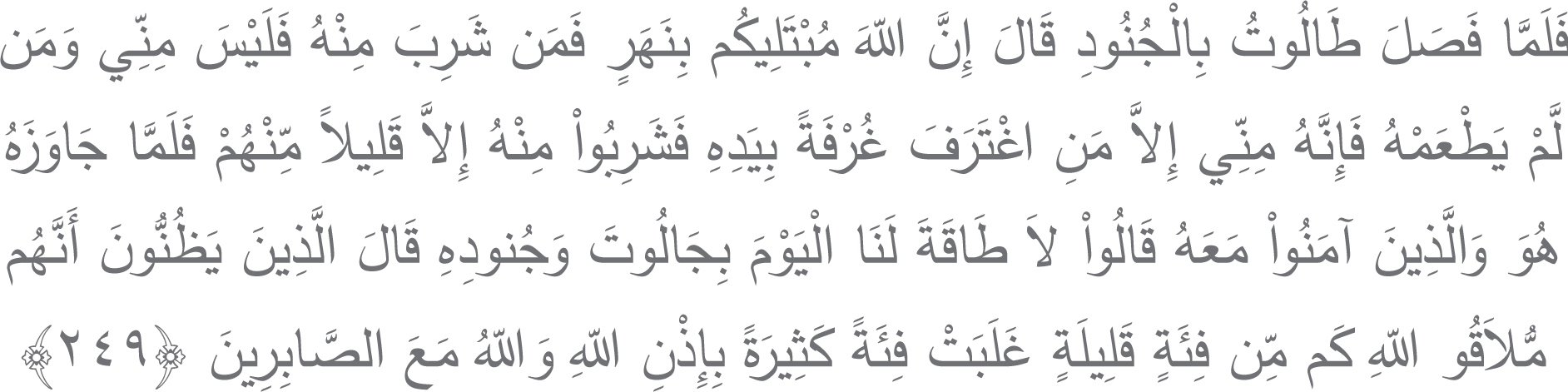 Mikor elrendezte Saul (Talut) a katonákat, mondá: „Allah próbára tesz titeket a folyóval. Aki ebből iszik, nem (katonáim) közül való. Csak ki nem kóstol bele, az tartozik hozzám, kivéve, ha csak egy kortyot nyel a kezéből.” Ittak belőle mind, csak kevesen nem közülük. Mikor ő és azok, akik vele hittek, átkeltek azon (folyón), mondák: „Nincs erőnk ma Góliát és katonái ellen.” De azok, kik várták, hogy találkozójuk legyen Allahhal, mondták: „Hányszor megesett, hogy kis csapat győzedelmeskedett nagy csapat felett, Allah engedelmével!” Allah az állhatatosakkal van. (Korán 2:249)