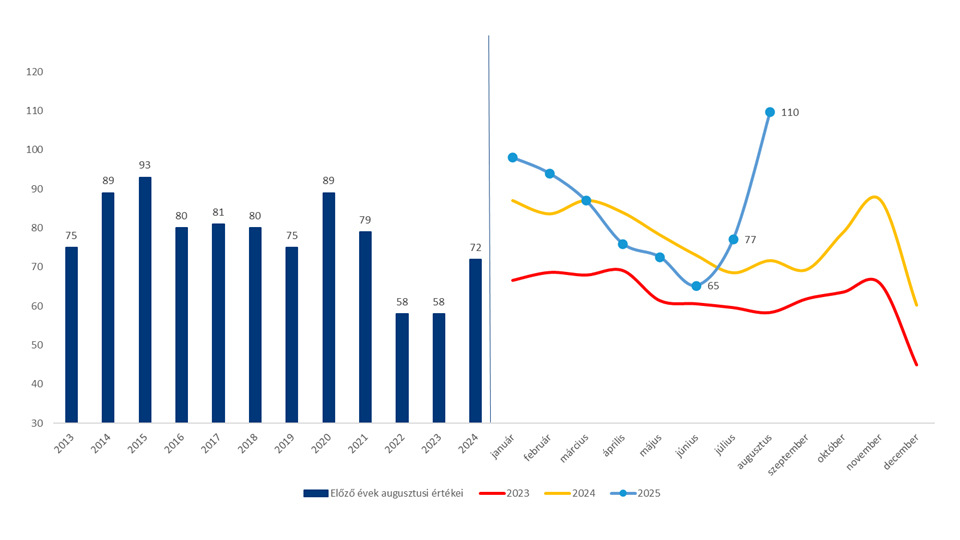 A Duna House havonta közli a keresletindexet az országos hálózatánál regisztrált új vevői érdeklődések száma alapján, amely pontos képet ad a lakáspiaci kereslet alakulásáról. A társaság friss tranzakció-becslése is alátámasztja a kereslet megugrását: augusztusban 11 369 adásvétel történt, ami éves szinten közel 22%-os, havi alapon pedig 20%-os bővülést jelent. Ez 2020 óta a legerősebb augusztusi forgalom, amelyet a program elindulása körüli felfokozott érdeklődés, valamint a program által nem érintettek előrehozott vásárlása is táplált.