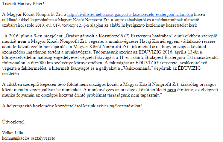 A cikkben szereplő munkát nem a Magyar Közút Nonprofit Zrt. végezte, a munkavégzésre Havaj Kornél egyéni vállalkozó részére adott ki közútkezelői hozzájárulást a Magyar Közút Nonprofit Zrt., tekintettel arra, hogy országos közúttal szomszédos ingatlanon történt a munkavégzés.