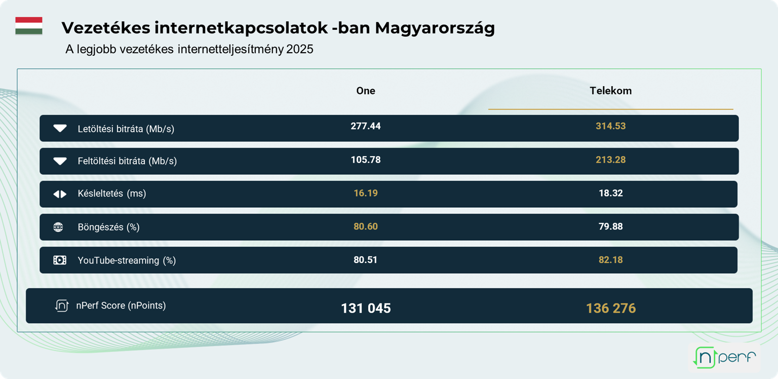 A Telekom vezeti a magyar vezetékes internet szektort 2025-ben az nPerf éves barométere szerint. Ez a kiadás erős versenyt mutat két nagy szereplő között, kiegészítő erősségekkel a csatlakozás és a válaszidő terén.