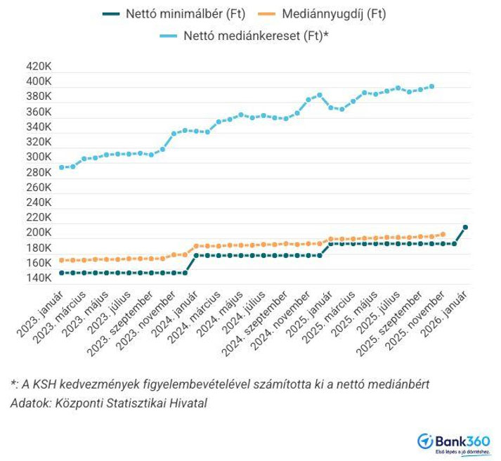 A nyugdíjak, mivel az emelésük az infláció mértékéhez vannak kötve, kisebb mértékben növekedtek, mint a minimálbér. Emiatt a nettó minimálbér és az átlagos nyugdíj összege egyre közelebb kerültek egymáshoz. Ezen valamelyest a több lépcsőben visszaépített 13. havi nyugdíj tudott változtatni, illetve a 2026-tól, részletekben bevezetett 14. havi nyugdíj is fog emelni az átlagon. Az alábbi ábrán látszik, hogy a nettó minimálbér emelkedése miként aránylott az elmúlt 10 évben az átlagnyugdíjhoz, illetve, hogy ezekhez képest hogyan alakult a nettó átlagkereset.