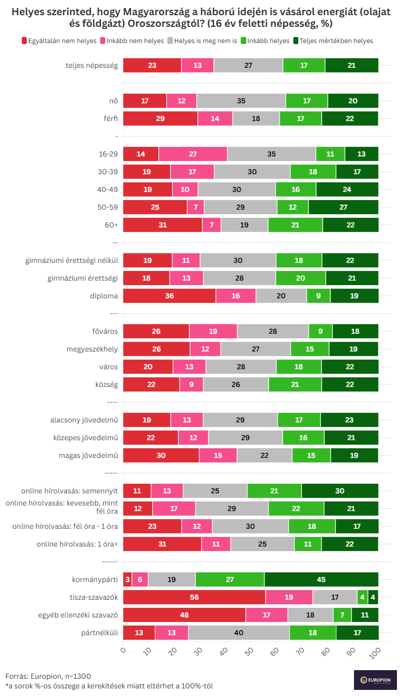 Az orosz energiaimport háborús kontextusban való megítélése szintén megosztó. Statisztikai hibahatáron belül, de valamivel többen vannakazok (38%), akik helyeslik, hogy Magyarország a háború alatt is Oroszországtól vásárol energiát, mint ahányan ellenzik (36%). Egyetértők főként a 60 év felettiek (43%), a községekben élők (43%), a hírolvasással legkevesebb időt töltők (51%),valamint a kormánypárti szavazók (72%) köreiben koncentrálódnak.