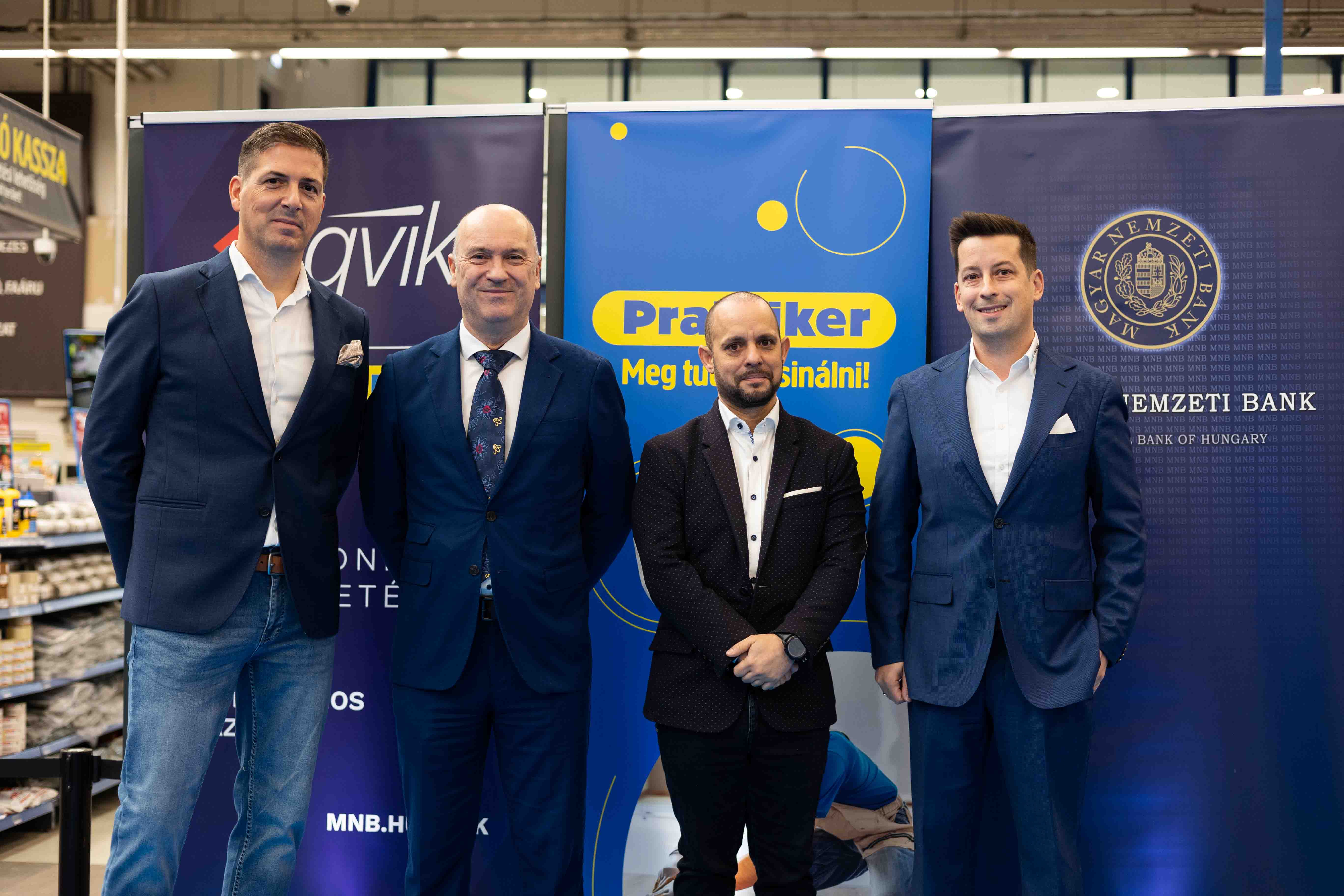 Balról jobbra: Flórián László (Praktiker Zrt., vezérigazgató), Bartha Lajos (MNB, pénzforgalomért, készpénzlogisztikáért és bankműveletekért felelős ügyvezető igazgató), Dr. Al-Absi Gáber Seif (SimplePay Zrt., vezérigazgató-helyettes), Bessenyei Attila Laurel Kft. ügyvezető)