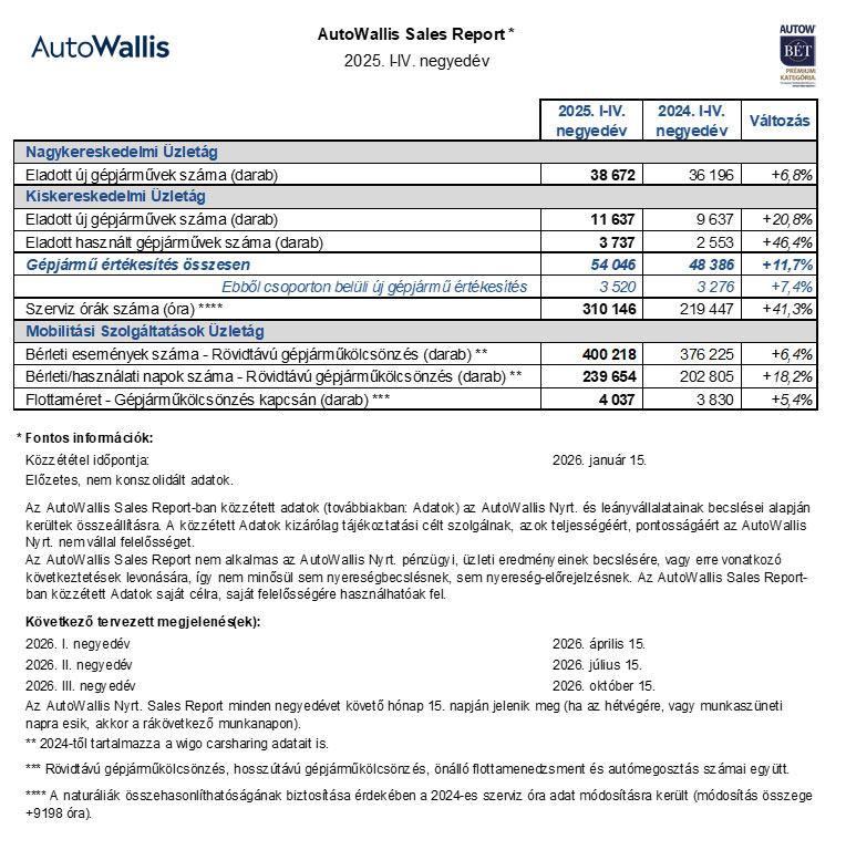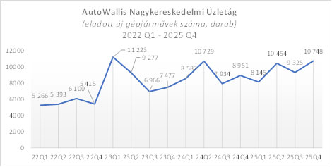 Az értékesítés növekedésének motorja 2025-ben az AutoWallis Kiskereskedelmi Üzletága volt, amely 20,8 százalékkal 11.637-re növelte újgépjármű-, míg 46,4 százalékkal 3.737 darabra a használtautó-eladásokat. Az üzletág növekedését elsősorban a 2024-ben lezárt cseh akvizíciók – az NC Auto (Stratos) három BMW márkakereskedése, valamint a Milan Král Group felvásárlása –, továbbá a 2024 őszén nyitott budapesti kereskedés, kisebb mértékben pedig a 2025 utolsó negyedévében nyitott debreceni kereskedések támogatták (együtt +2.046 db). A szervizórák száma 41,3 százalékkal 310.146 órára emelkedett 2025-ben, ami az akvizícióknak és az új kereskedésekhez kapcsolódó szervizeknek köszönhető.