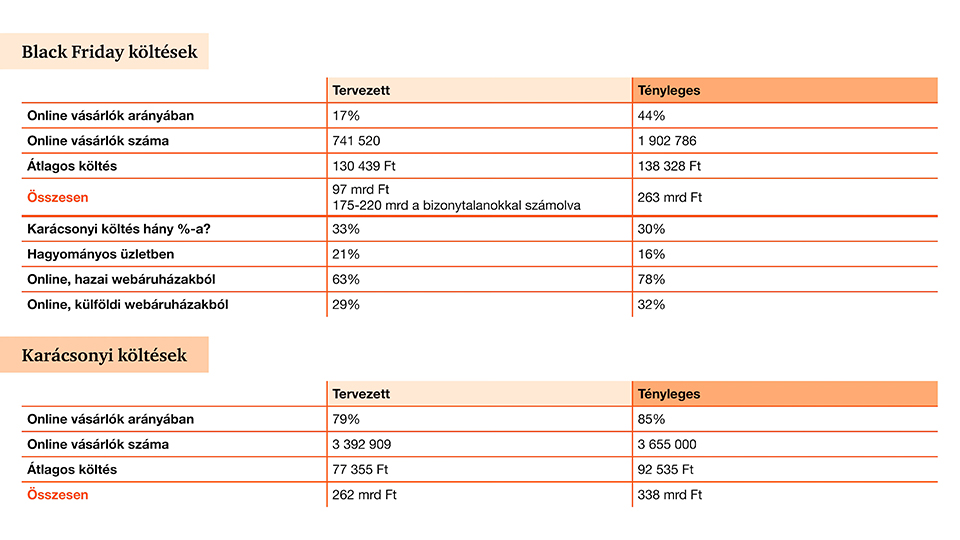Az év eleji, gazdasági bizonytalansággal terhelt időszakban a háztartások visszafogottabb költési terveket fogalmaztak meg, sokan inkább megtakarításra törekedtek, és elhalasztották nagyobb kiadásaikat. Az év végére azonban az elhalasztott költések egy részét megvalósították, köszönhetően a valóban kedvező akcióknak, vonzó ajánlatoknak is, és a hagyományos üzletek helyett nagyobb hangsúly volt az online vásárláson. Ennek eredményeként a Black Friday és a karácsonyi vásárlási szezon költései az online kereskedelem területén egyaránt felülmúlták a korábban mérsékeltnek tekinthető várakozásokat