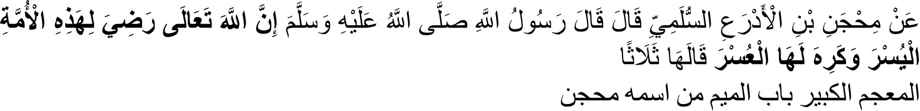 Mihjan ibn al-Adra’ reported: The Messenger of Allah, peace and blessings be upon him, said, “Verily, Allah Almighty is pleased for this nation to be at ease, and He is displeased for it to be in difficulty,” and the Prophet said it three times.