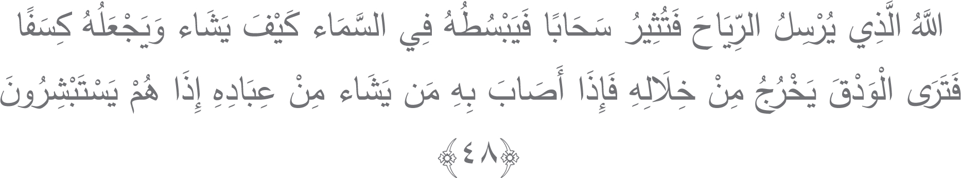 It is Allah Who sends the Winds, and they raise the Clouds: then does He spread them in the sky as He wills, and break them into fragments, until thou seest rain-drops issue from the midst thereof: then when He has made them reach such of his servants as He wills behold, they do rejoice!- (Quran 30:48)
