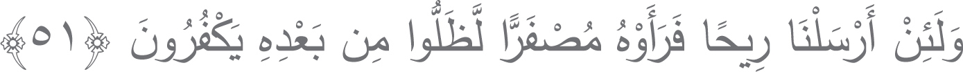 And if We (but) send a Wind from which they see (their tilth) turn yellow,- behold, they become, thereafter, Ungrateful (Unbelievers)! (Quran 30:51)